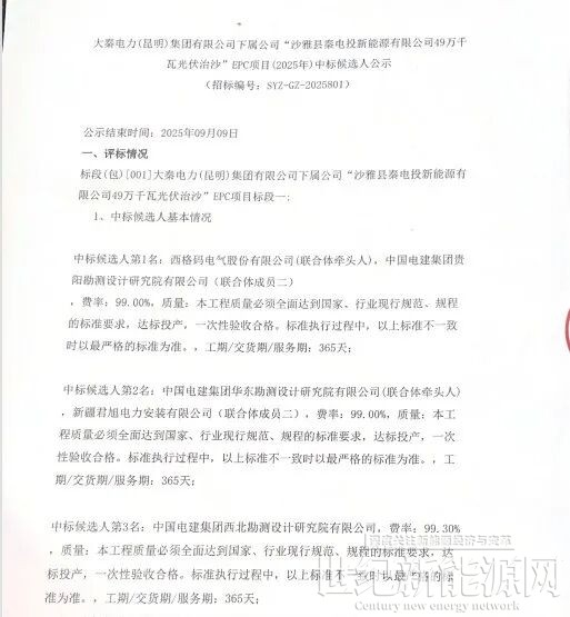 9月5日,大秦电力(昆明)集团有限公司下属公司“沙雅县秦电投新能源有限公司49万千瓦光伏治沙”EPC项目(2025年)中标候选人公示。从中标候选人结果来看:投标报价2.289~2.650元/W。