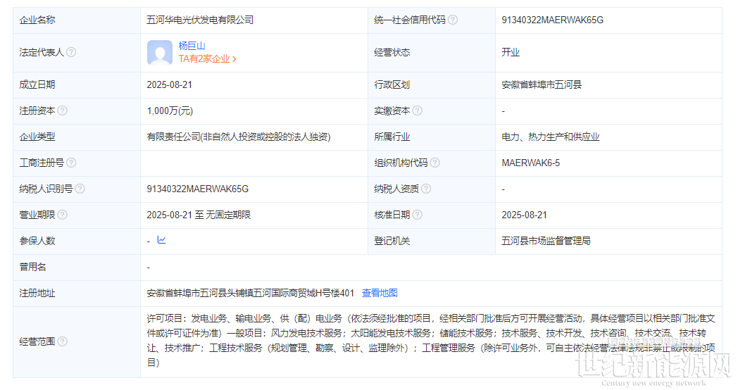 近日,五河华电光伏发电有限公司成立,法定代表人为杨巨山,注册资本为1000万元,经营范围包含:发电业务、输电业务、供(配)电业务;风力发电技术服务;太阳能发电技术服务;储能技术服务等。