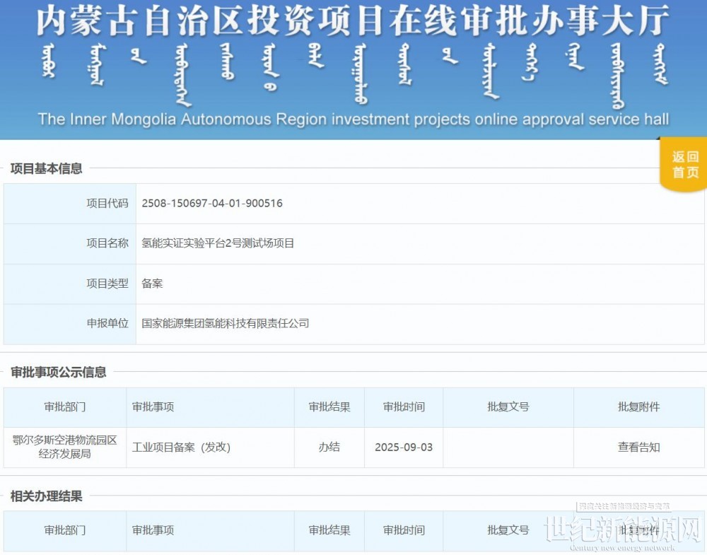根据项目公示,氢能实证实验平台2号测试场项目位于鄂尔多斯市--鄂尔多斯空港物流园区--空港物流园区中央生态大道上行线东、纬十七路南、经三南路西、纬十六路北。项目单位为国家能源集团氢能科技有限责任公司。