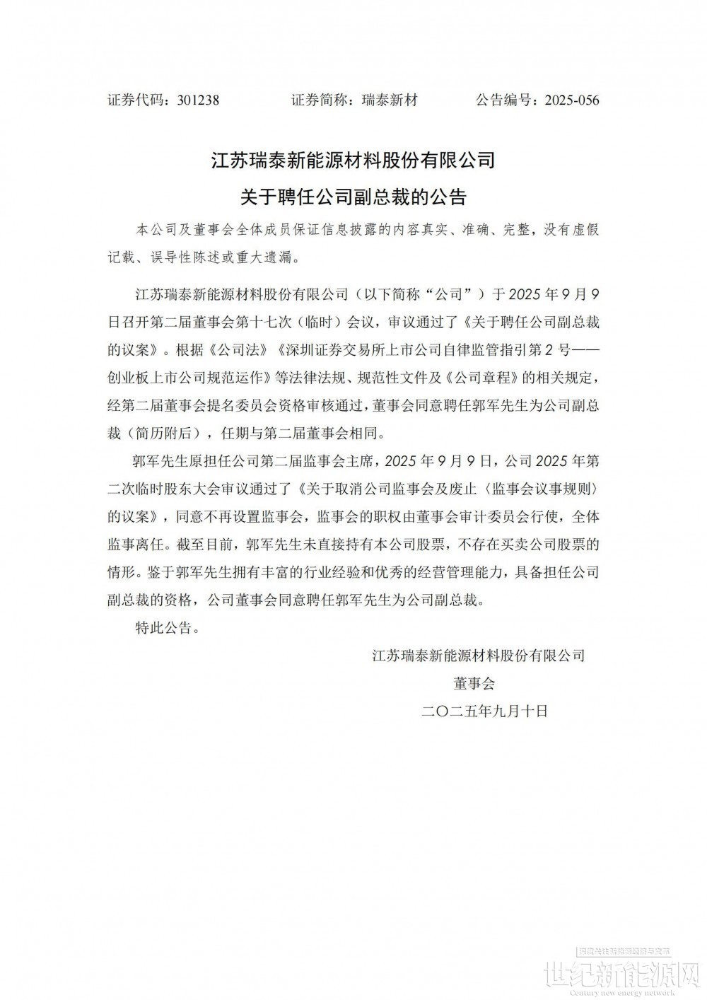 9月9日,瑞泰新材发布公告称,公司召开第二届董事会第十七次(临时)会议,审议通过了《关于聘任公司副总裁的议案》。经第二届董事会提名委员会资格审核通过,董事会同意聘任郭军先生为公司副总裁,任期与第二届董事会相同。