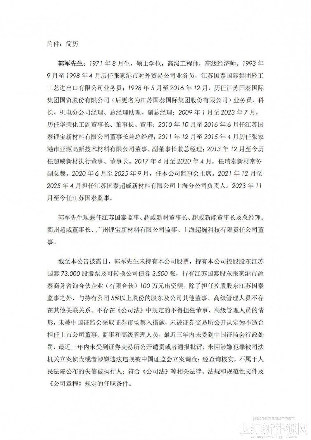 郭军先生:1971年8月生,硕士学位,高级工程师,高级经济师。1993年9月至1998年4月历任张家港市对外贸易公司业务员,江苏国泰国际集团轻工工艺进出口有限公司业务员;1998年5月至2016年12月,历任江苏国泰国际集团国贸股份有限公司(后更名为江苏国泰国际集团股份有限公司)业务员、科长、机电分公司经理、总经理助理、副总经理;2009年1月至2023年7月,历任华荣化工副董事长、董事长、董事;2010年10月至2016年6月任江苏国泰锂宝新材料有限公司董事长兼总经理;2011年12月至2015年4月历任张家港市亚源高新技术材料有限公司董事、副董事长兼总经理;2013年12月至今历任超威新材执行董事、董事长。2017年4月至2020年4月,任瑞泰新材常务副总裁。2020年6月至2025年9月,任本公司监事会主席。2021年12月至2025年4月担任江苏国泰超威新材料有限公司上海分公司负责人。2023年11月至今任江苏国泰监事。