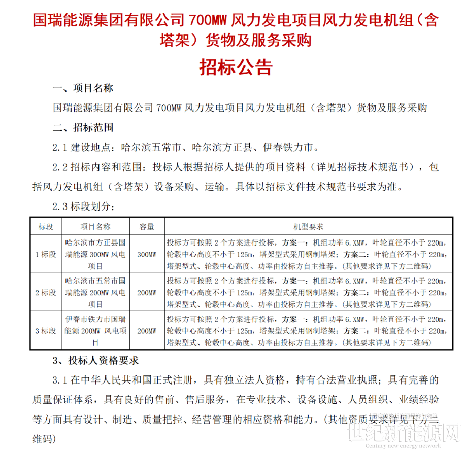 9月10日,国瑞集团发布《国瑞能源集团有限公司700MW风力发电项目风力发电机组(含塔架)货物及服务采购招标公告》。《公告》显示,本次招标分为三个标段,规模共计700MW。项目地点分别位于哈尔滨市五常市、哈尔滨市方正县、伊春市铁力市。