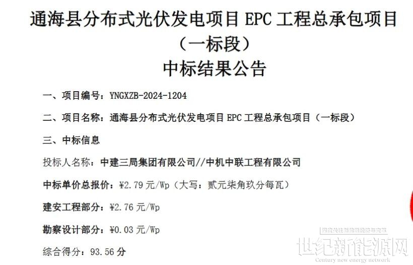 从今年1月公布的中标结果了解到,原中标候选人为中建三局集团有限公司//中机中联工程有限公司。中标单价为2.79元/Wp,其中建安工程部分2.76元/Wp、勘察部分0.03元/Wp。