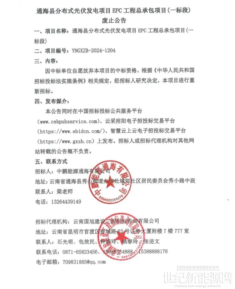 9月8日,通海县分布式光伏发电项目EPC工程总承包项目(一标段) 废止公告发布。