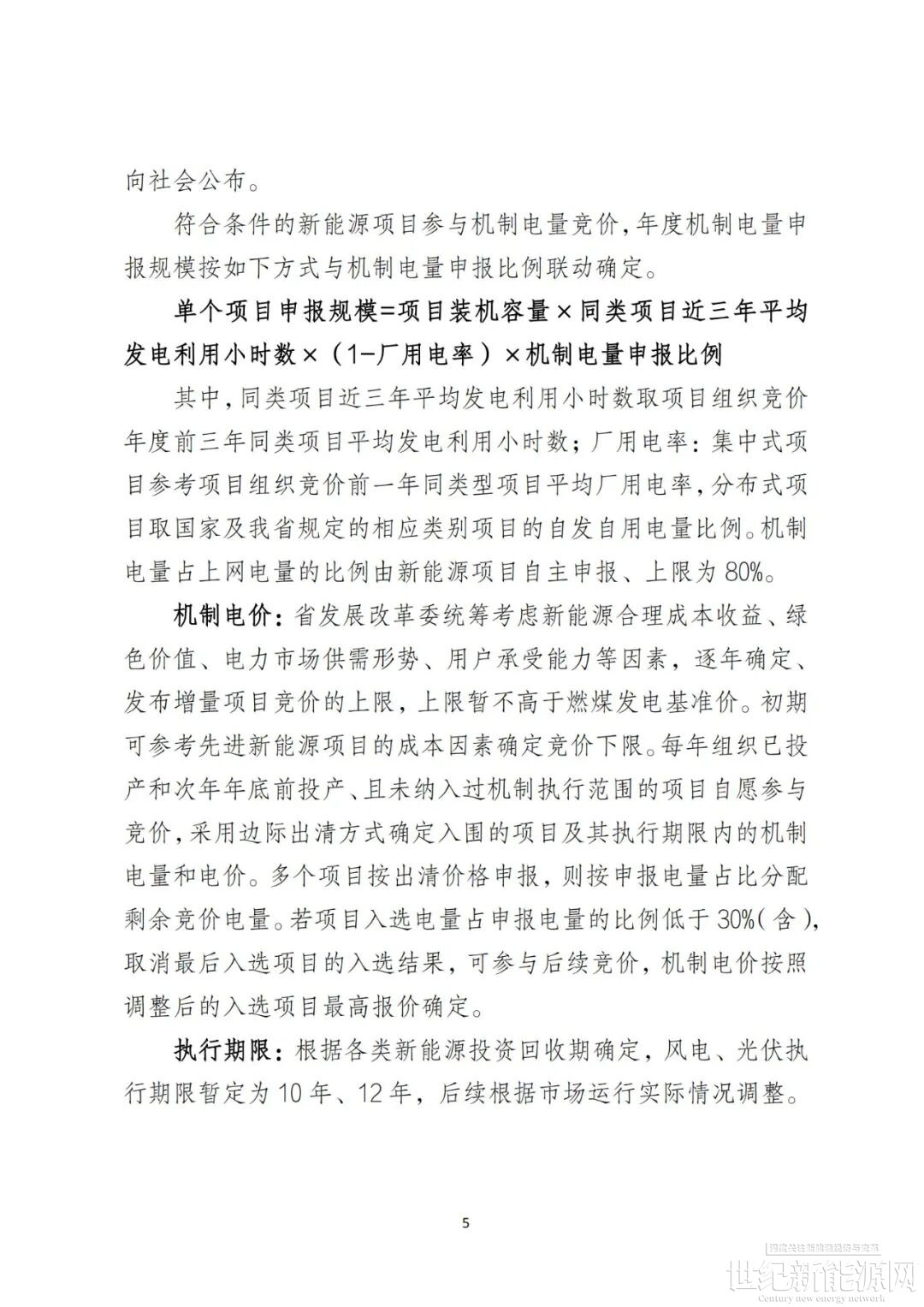 单个项目申报规模=项目装机容量×同类项目近三年平均发电利用小时数×(1-厂用电率)×机制电量申报比例其中,同类项目近三年平均发电利用小时数取项目组织竞价年度前三年同类项目平均发电利用小时数;厂用电率:集中式项5目参考项目组织竞价前一年同类型项目平均厂用电率,分布式项目取国家及我省规定的相应类别项目的自发自用电量比例。机制电量占上网电量的比例由新能源项目自主申报、上限为80%。