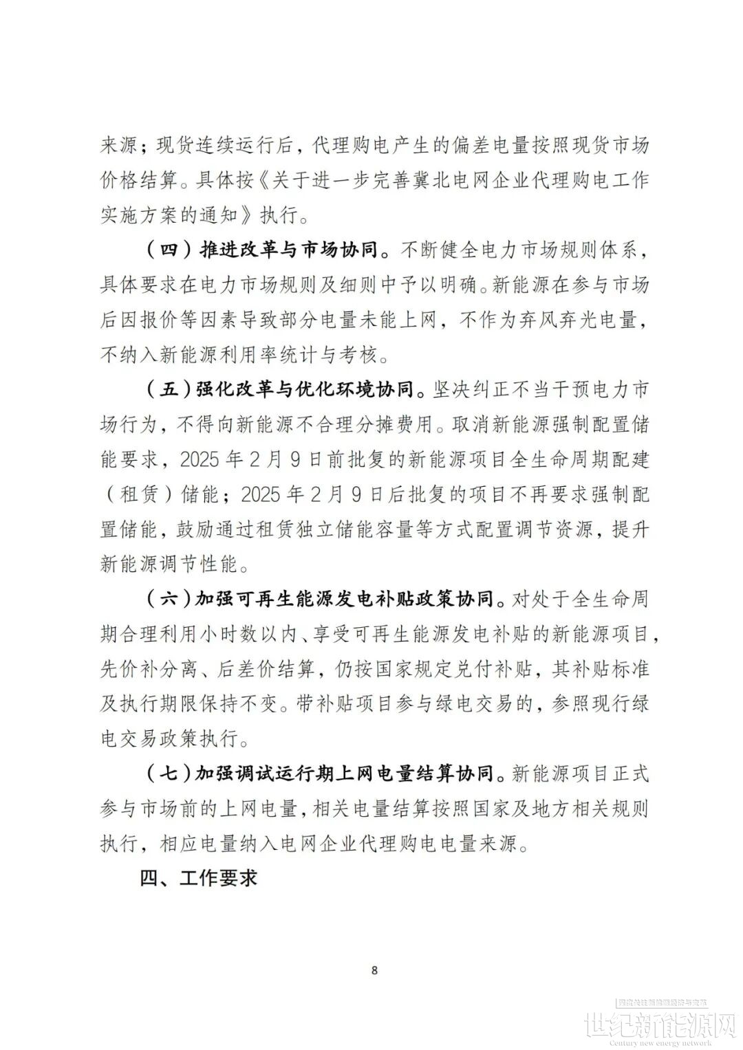 坚决纠正不当干预电力市场行为,不得向新能源不合理分摊费用。取消新能源强制配置储能要求,2025年2月9日前批复的新能源项目全生命周期配建(租赁)储能;2025年2月9日后批复的项目不再要求强制配置储能,鼓励通过租赁独立储能容量等方式配置调节资源,提升新能源调节性能。