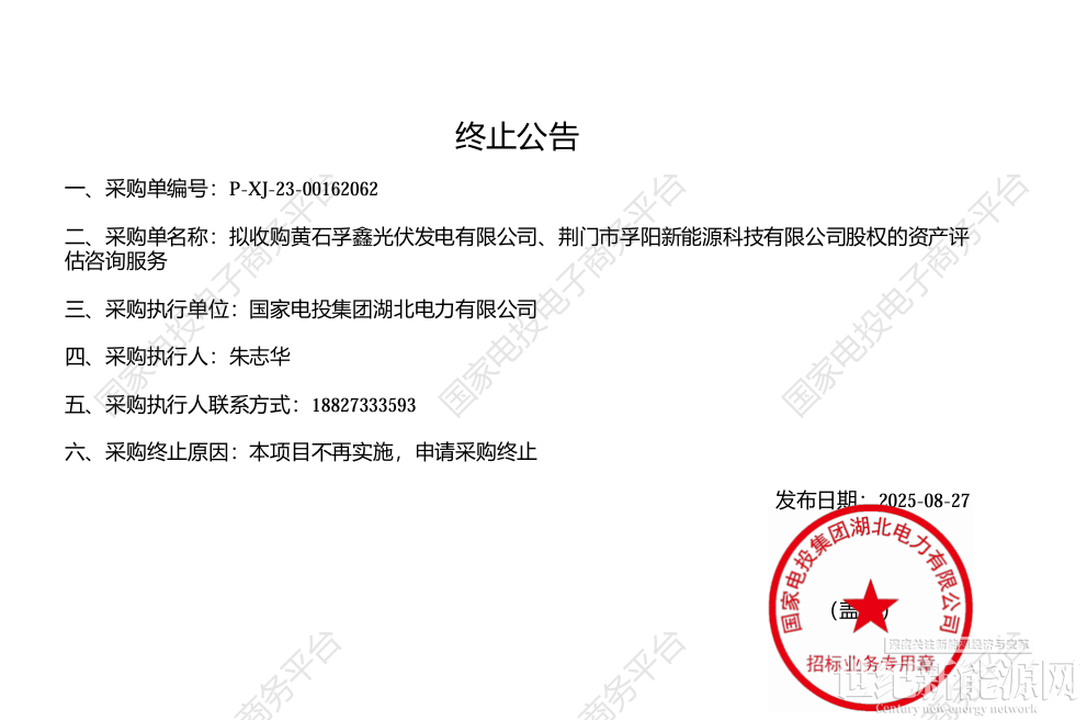 日前,国家电投湖北电力公司发布拟收购黄石孚鑫光伏发电有限公司、荆门市孚阳新能源科技有限公司股权的资产评估咨询服务终止的公告,原因系本项目不再实施。