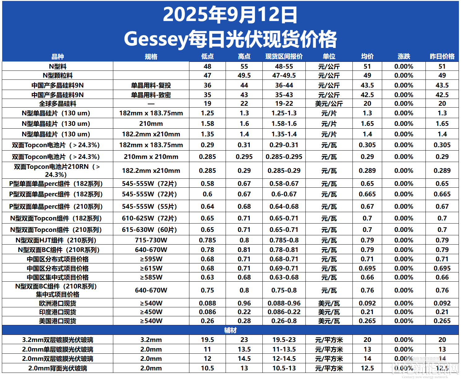 今日组件价格整体维稳,双面单晶perc组件(182系列)价格在0.6-0.67元/ 瓦,均价为0.665元/瓦。双面单晶perc组件(210系列)价格在0.64-0.68元/ 瓦,均价为0.67元/瓦。N型双面Topcon 组件(182系列)价格在0.65-0.71元/ 瓦,均价为0.7元/瓦。N型双面Topcon 组件(210系列)价格在0.65-0.71元/ 瓦,均价为0.7元/瓦。N型双面HJT组件(210系列)价格在0.785-0.8元/ 瓦,均价为0.79元/瓦。N型双面BC组件(210R系列)价格在0.78-0.81元/ 瓦,均价为0.79元/瓦。中国区分布式项目(≥595W)价格在0.68-0.71元/瓦,均价为0.71元/瓦,中国区分布式项目(≥615W)价格在0.68-0.71元/瓦,均价为0.695元/瓦,中国区集中式项目(≥585W)价格在0.63-0.68元/ 瓦,均价为0.66元/瓦。N型双面BC组件(210R系列)集中式项目价格在0.75-0.8元/ 瓦,均价为0.76元/瓦。欧洲港口现货价格在0.088-0.96美元/ 瓦,均价为0.092美元/瓦。印度港口现货价格在0.086-0.22美元/ 瓦,均价为0.21美元/瓦。美国港口现货价格在0.26-0.28美元/ 瓦,均价为0.265美元/瓦。