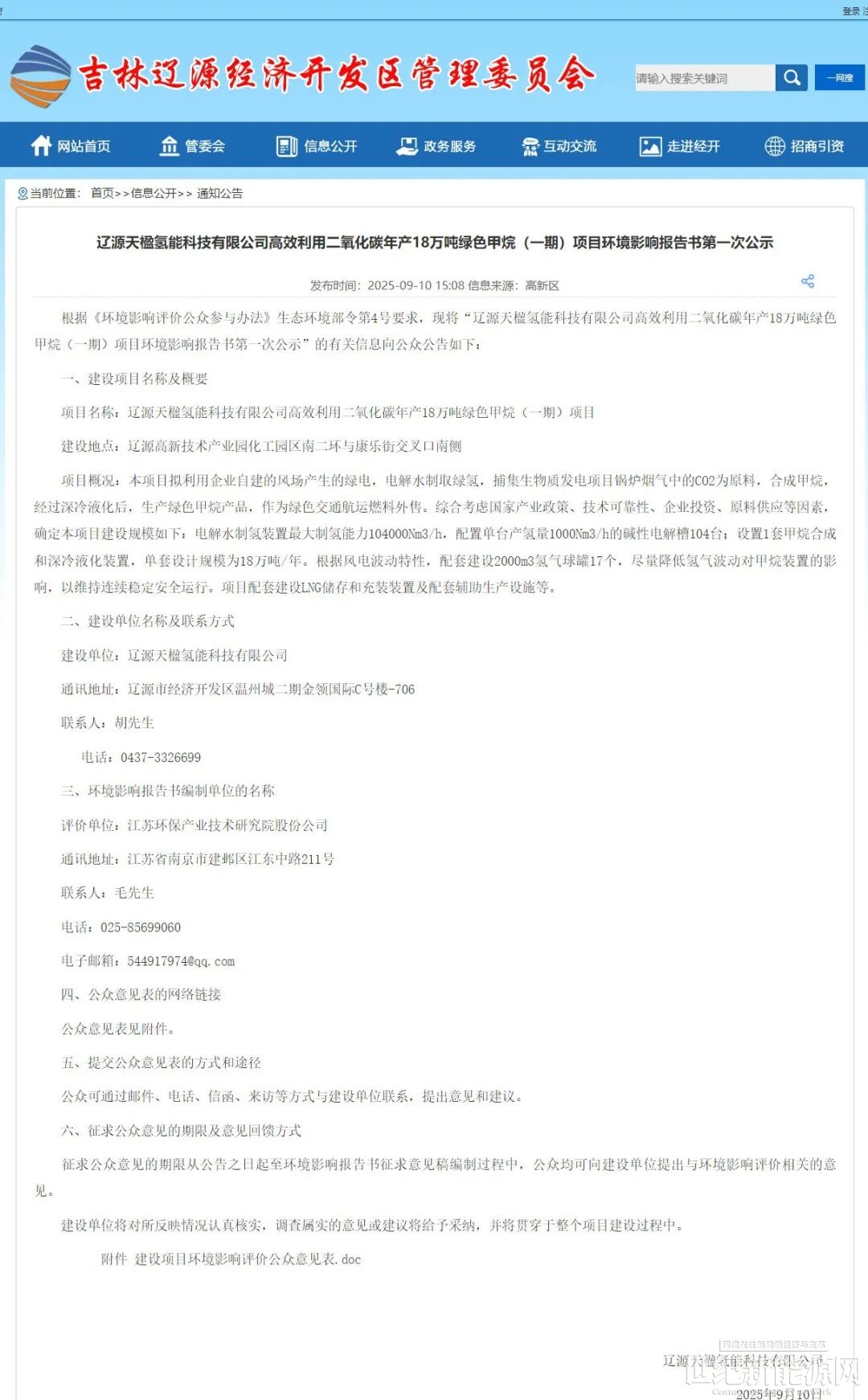9月10日,吉林辽源经济开发区管委会官网发布辽源天楹氢能科技有限公司高效利用二氧化碳年产18万吨绿色甲烷(一期)项目环境影响报告书第一次公示。