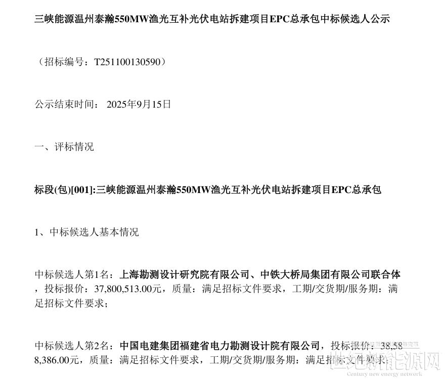 日前,三峡能源温州泰瀚550MW渔光互补光伏电站拆建项目EPC总承包公示中标候选人,上海勘测设计院与中铁大桥局集团联合体以2.54元/瓦的报价位列第一中标候选人。
