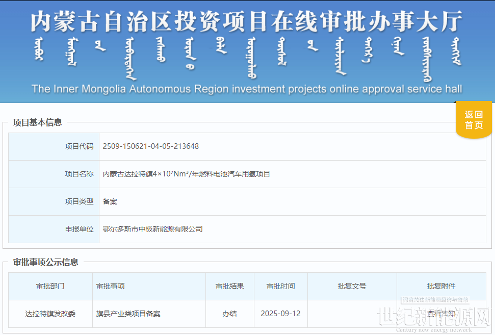鄂尔多斯市中极新能源有限公司提交的内蒙古达拉特旗4×10⁷Nm³/年燃料电池汽车用氢项目旗县产业类项目备案项目,符合产业政策和市场准入标准,准予备案。