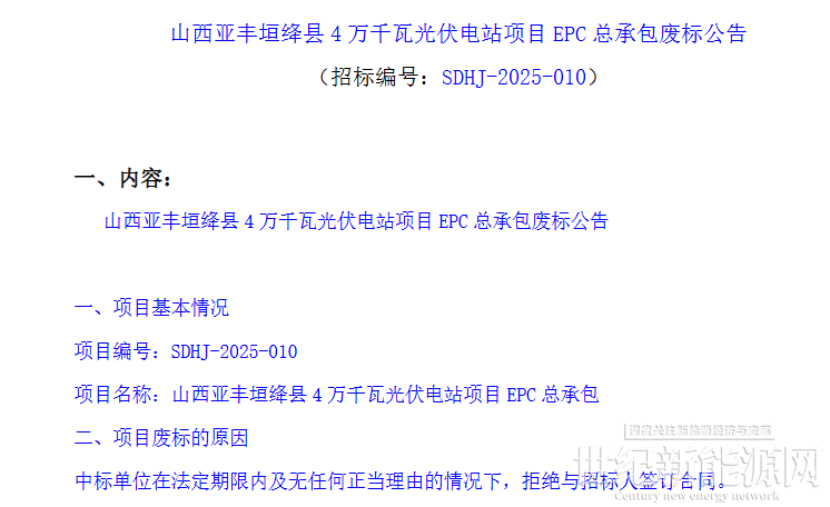 9月11日,【山西亚丰垣绛县4万千瓦光伏电站项目EPC总承包废标公告】发布。公告显示,项目废标原因为:中标单位在法定期限内及无任何正当理由的情况下,拒绝与招标人签订合同。