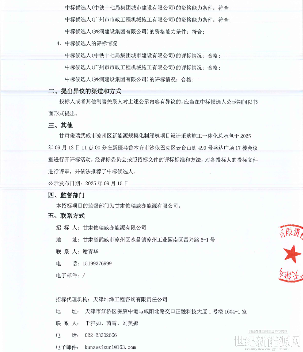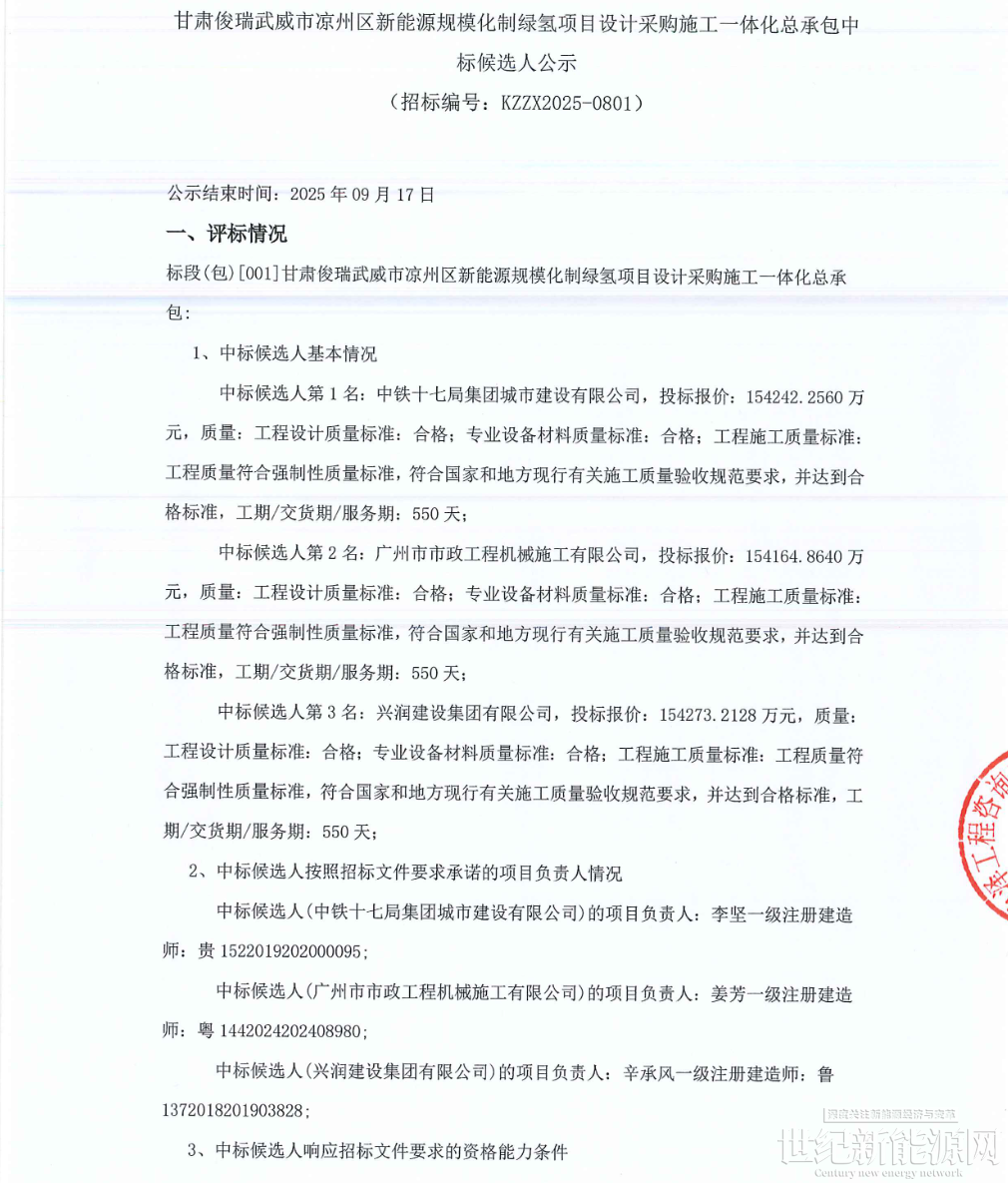 9月15日,甘肃俊瑞武威市凉州区新能源规模化制绿氢项目设计采购施工一体化总承包中标候选人公示。