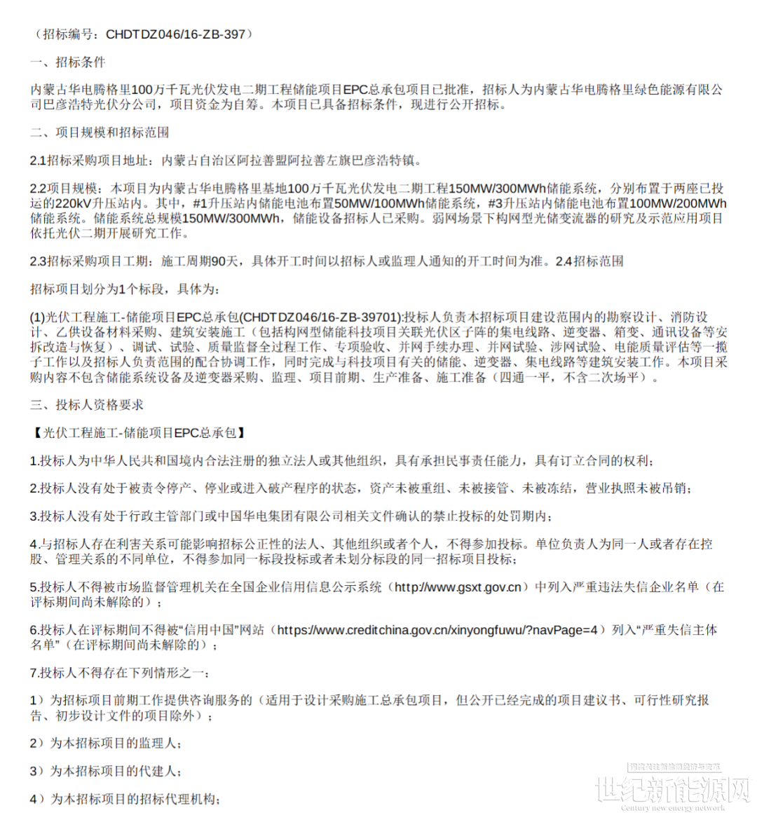 9月15日,内蒙古华电腾格里100万千瓦光伏发电二期工程储能项目EPC总承包招标。