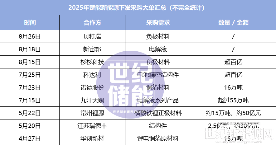 为保障项目扩产中的原材料稳定供应,2025年楚能新能源已密集签署超9项长期采购协议,涵盖电解液、负极材料、铜箔、结构件、正极材料等多个锂电关键环节,预计总采购金额已超300亿元。