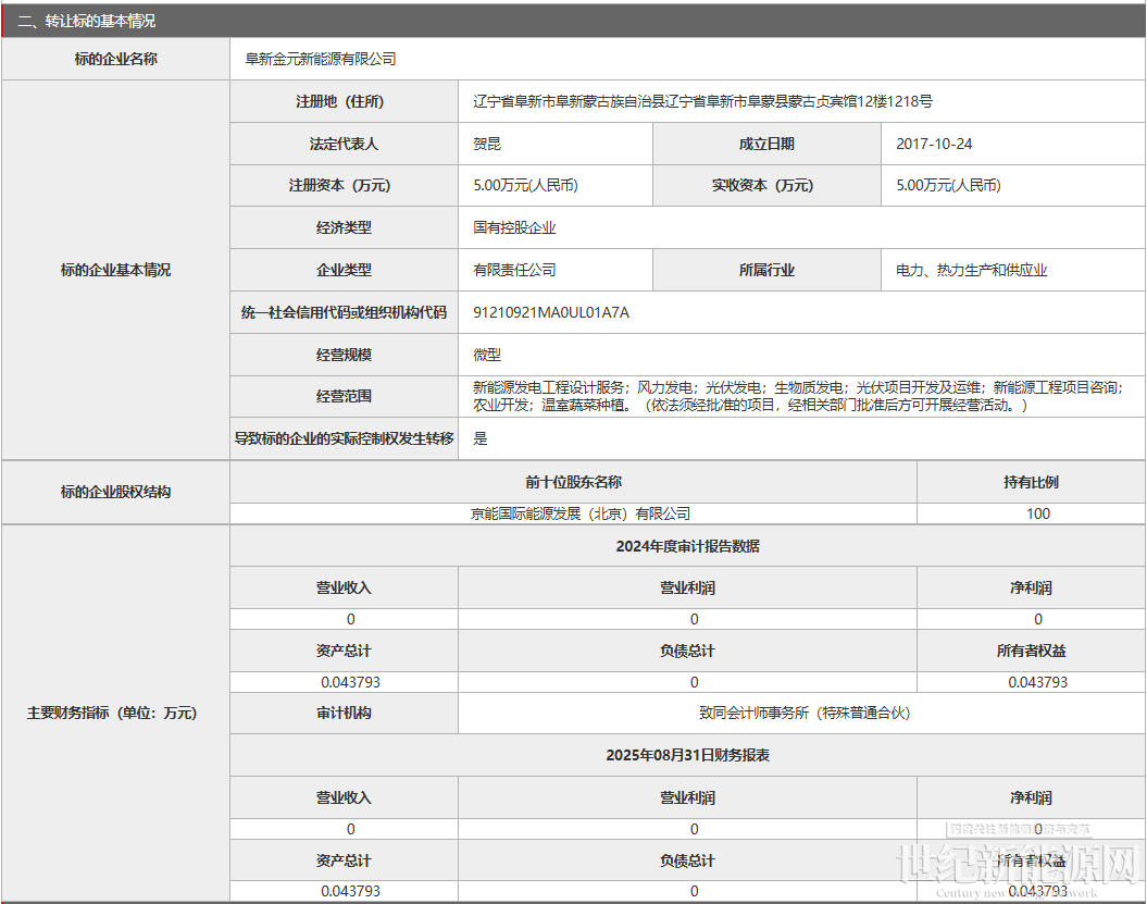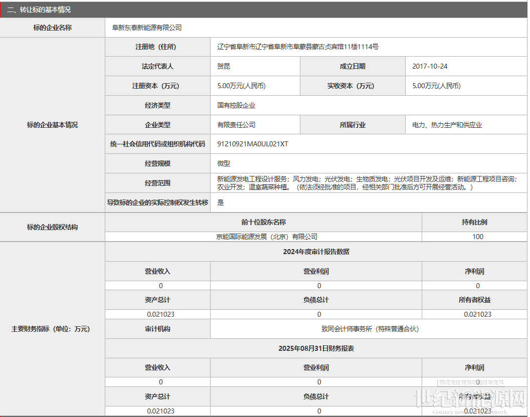 9月16日,京能国际能源发展(北京)有限公司挂牌转让7家新能源项目公司100%股权,分别是阜新爱友新能源有限公司、阜新东泰新能源有限公司、阜新架木苏新能源有限公司、阜新金元新能源有限公司、阜新赛纳新能源有限公司、阜新塞罕新能源有限公司、阜新吉娅泰新能源有限公司。