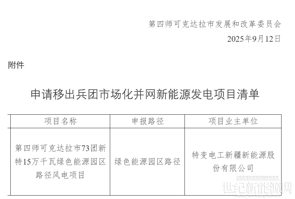 9月12日,新疆兵团第四师可克达拉市发布《关于将73团新特15万千瓦绿色能源园区路径风电项目移出兵团市场化并网新能源发电项目清单的公示》。