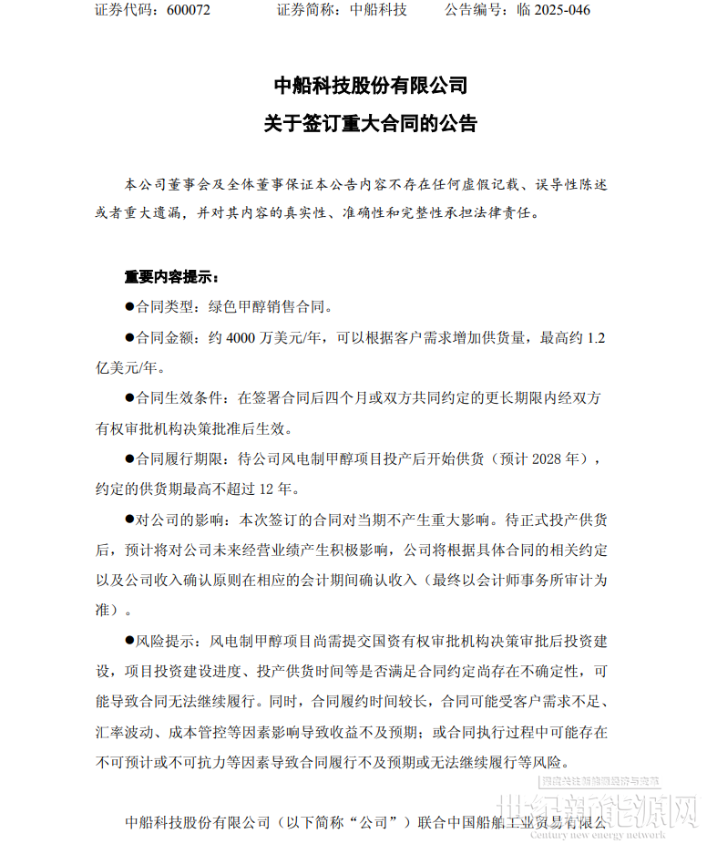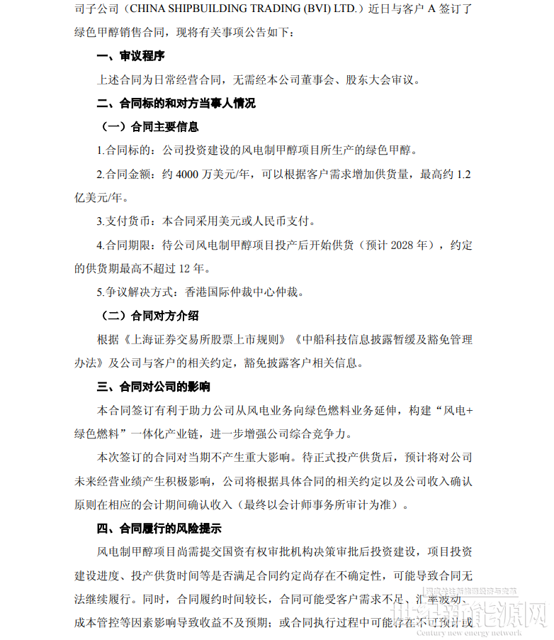 公告称,公司联合中国船舶工业贸易有限公司子公司与客户A签订了绿色甲醇销售合同,合同金额约4000万美元/年,可根据客户需求增加供货量,最高约1.2亿美元/年。合同预计在公司风电制甲醇项目投产后开始供货,供货期最高不超过12年。