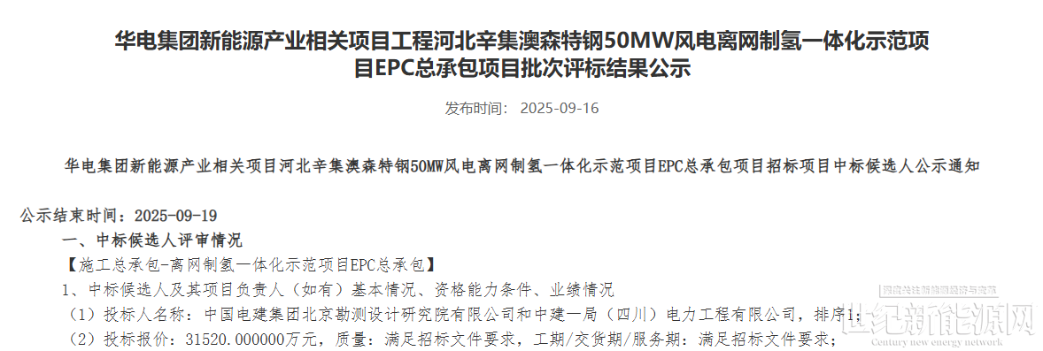 中国华电近日发布《华电集团新能源产业相关项目工程河北辛集澳森特钢50MW风电离网制氢一体化示范项目EPC总承包项目批次评标结果公示》。