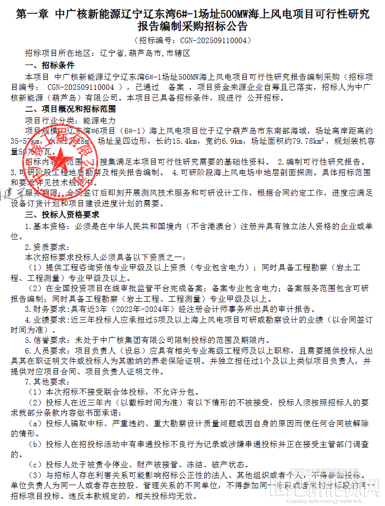 9月18日,中广核新能源辽宁辽东湾6#-1场址500MW海上风电项目可行性研究报告编制采购招标。