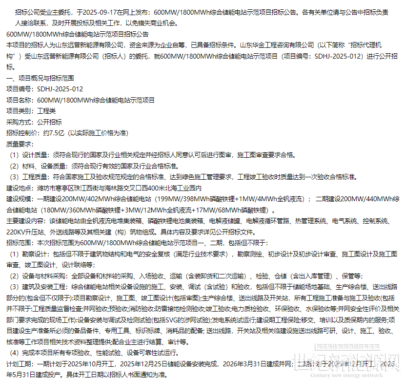 近日,600MW/1800MWh综合储能电站示范项目招标公告发布,本项目的招标人为山东远普新能源有限公司。此次招标控制价约7.5亿(以实际施工价格为准),建设地点位于潍坊市寒亭区。