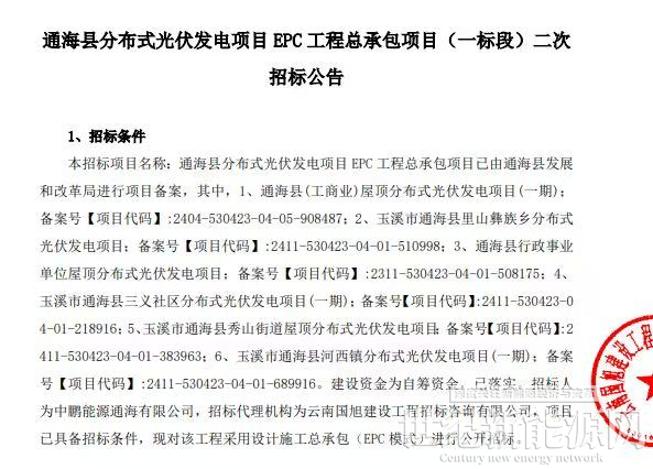 9月16日,云南省玉溪市通海县分布式光伏发电项目EPC工程总承包项目(一标段) 发布二次招标公告,招标人为中鹏能源通海有限公司。