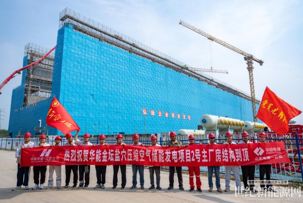 日前,由山东电建一公司承建的华能金坛2×350兆瓦盐穴压缩空气储能发电项目2号主厂房结构顺利到顶,标志着项目建设取得阶段性突破,为后续设备安装及整体工程推进奠定了坚实基础。