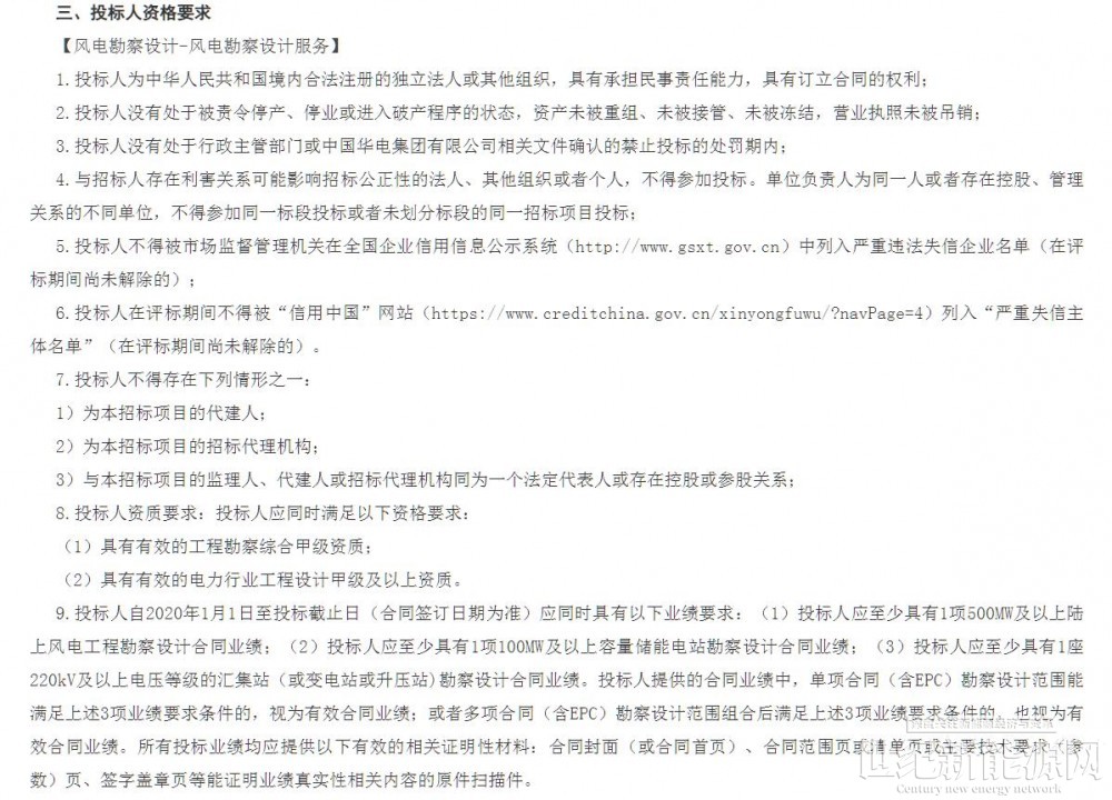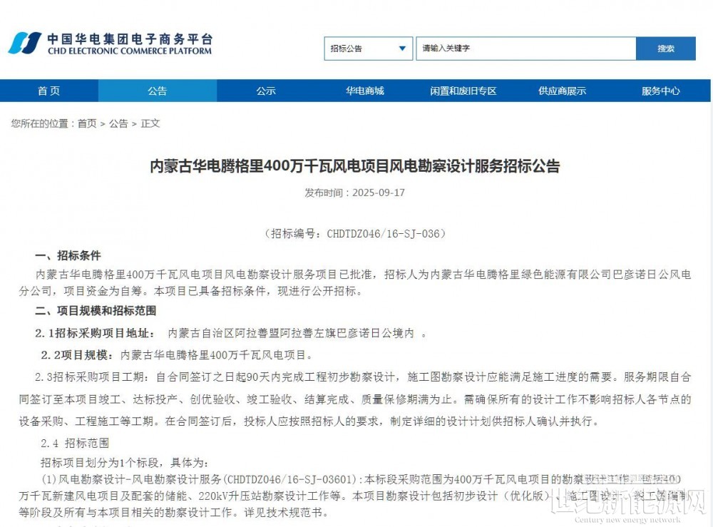 9月17日,内蒙古华电腾格里400万千瓦风电项目风电勘察设计服务招标公告发布。