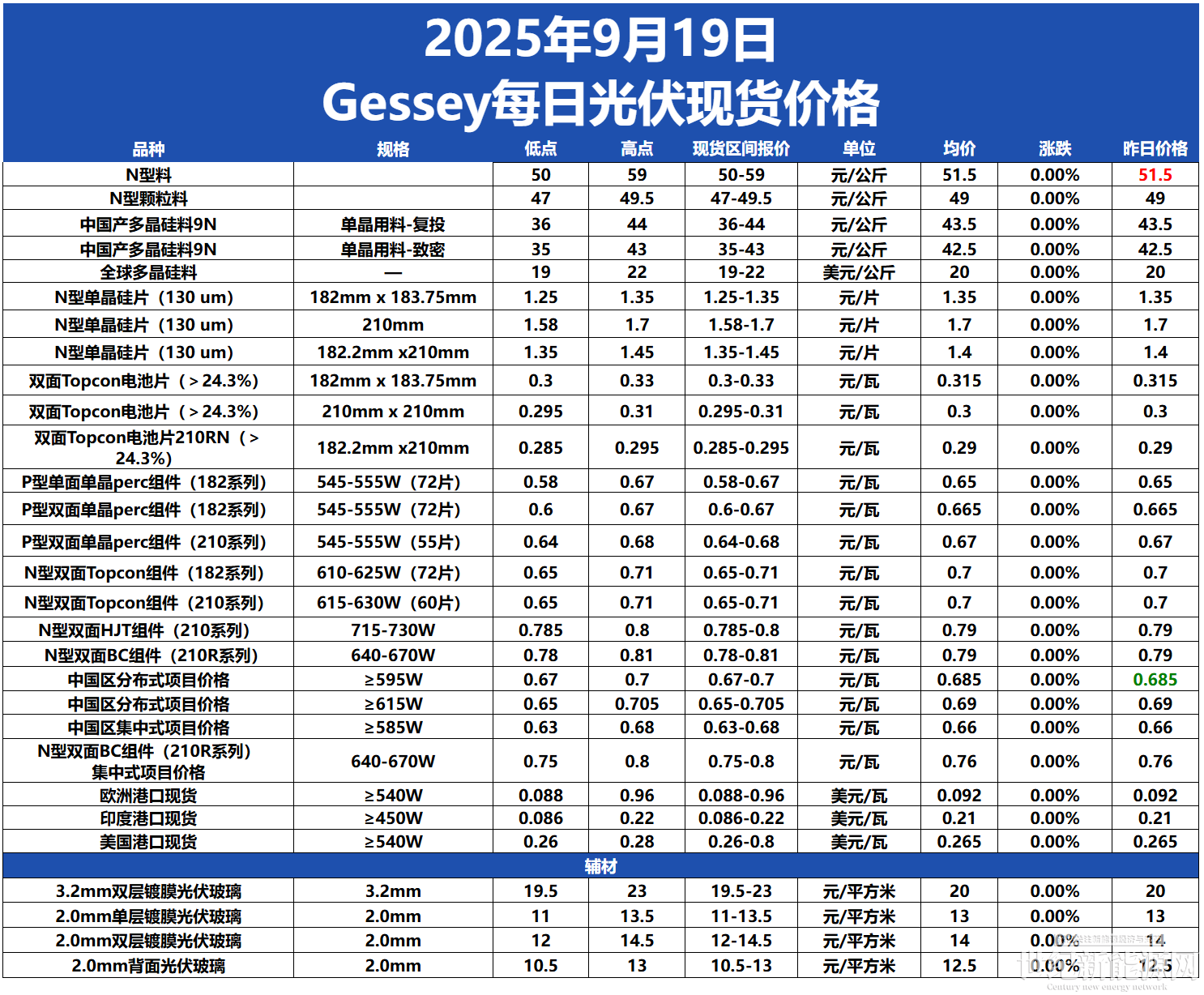今日组件价格整体维稳,双面单晶perc组件(182系列)价格在0.6-0.67元/ 瓦,均价为0.665元/瓦。双面单晶perc组件(210系列)价格在0.64-0.68元/ 瓦,均价为0.67元/瓦。N型双面Topcon 组件(182系列)价格在0.65-0.71元/ 瓦,均价为0.7元/瓦。N型双面Topcon 组件(210系列)价格在0.65-0.71元/ 瓦,均价为0.7元/瓦。N型双面HJT组件(210系列)价格在0.785-0.8元/ 瓦,均价为0.79元/瓦。N型双面BC组件(210R系列)价格在0.78-0.81元/ 瓦,均价为0.79元/瓦。中国区分布式项目(≥595W)价格在0.67-0.7元/瓦,均价为0.685元/瓦,中国区分布式项目(≥615W)价格在0.65-0.705元/瓦,均价为0.69元/瓦,中国区集中式项目(≥585W)价格在0.63-0.68元/ 瓦,均价为0.66元/瓦。N型双面BC组件(210R系列)集中式项目价格在0.75-0.8元/ 瓦,均价为0.76元/瓦。欧洲港口现货价格在0.088-0.96美元/ 瓦,均价为0.092美元/瓦。印度港口现货价格在0.086-0.22美元/ 瓦,均价为0.21美元/瓦。美国港口现货价格在0.26-0.28美元/ 瓦,均价为0.265美元/瓦。