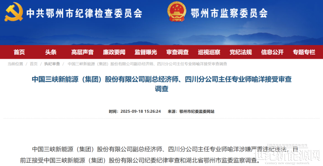 据鄂州市纪委监委网站9月18日消息,中国三峡新能源(集团)股份有限公司副总经济师、四川分公司主任专业师喻洋涉嫌严重违纪违法,目前正接受中国三峡新能源(集团)股份有限公司纪委纪律审查和湖北省鄂州市监委监察调查。