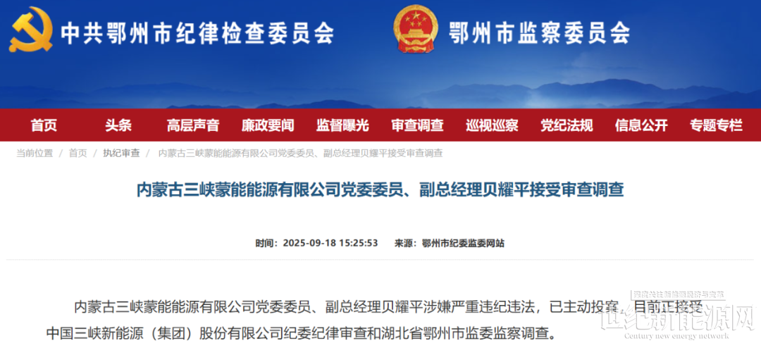 内蒙古三峡蒙能能源有限公司党委委员、副总经理贝耀平涉嫌严重违纪违法,已主动投案,目前正接受中国三峡新能源(集团)股份有限公司纪委纪律审查和湖北省鄂州市监委监察调查。