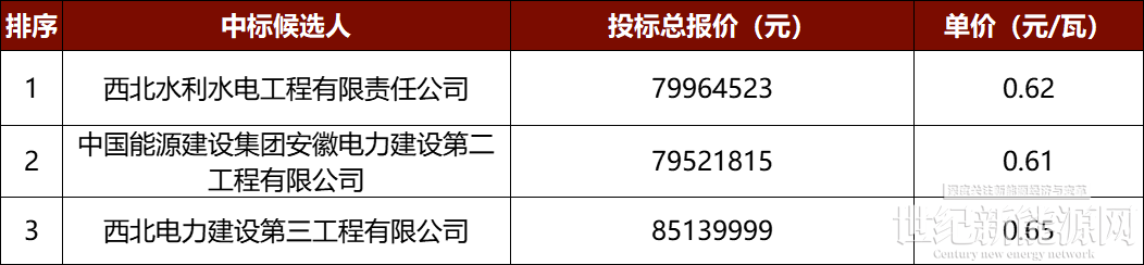 9月18日,中广核新能源安徽安庆迎江100MW渔光一体光伏复合项目总承包工程中标候选人公示,西北水利水电工程有限责任公司以0.62元/瓦位列第一候选人,招标人为中广核电力(安庆)有限公司,该项目直流侧安装容量为130.0152MWp。