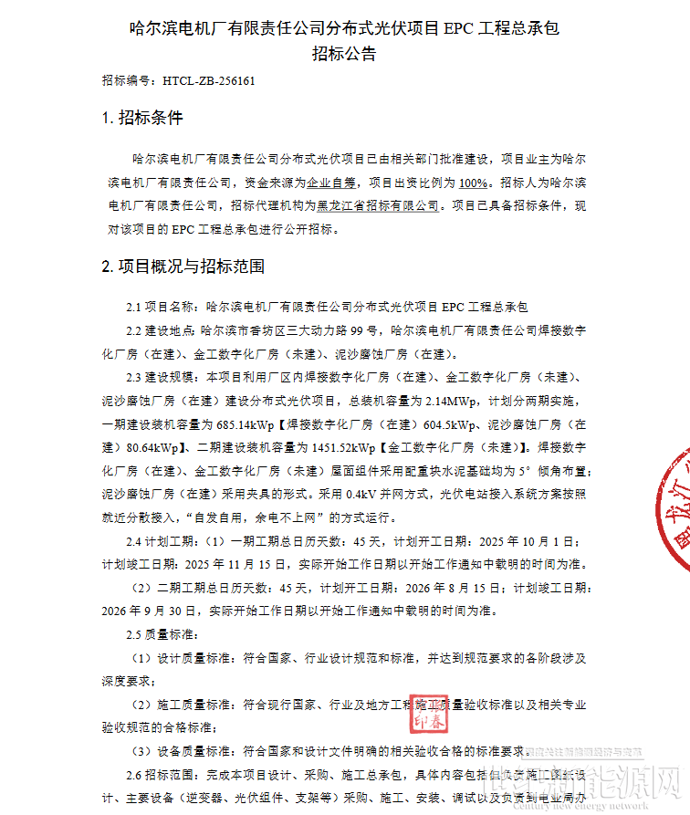 9月18日,黑龙江【哈尔滨电机厂有限责任公司2.14MW分布式光伏EPC】中标候选人公示!其中: