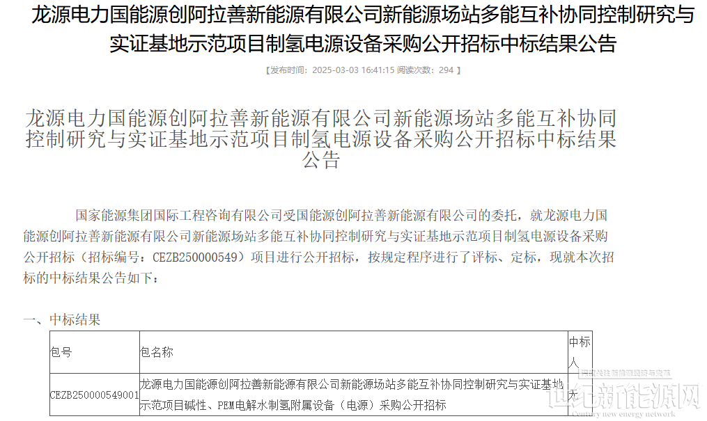 3月3日,龙源电力国能源创阿拉善新能源有限公司新能源场站多能互补协同控制研究与实证基地示范项目制氢电源设备采购公开招标中标结果公告,无中标人。