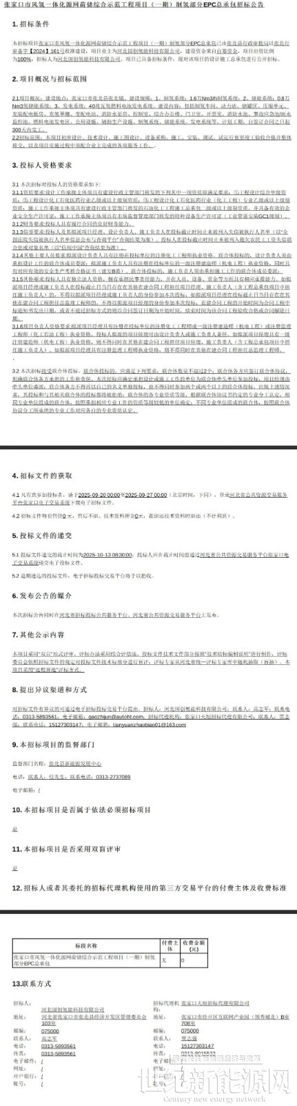 9月19日,张家口市风氢一体化源网荷储综合示范工程项目(一期)制氢部分EPC总承包招标公告。