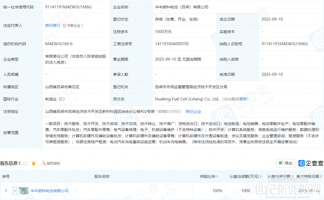 企查查信息显示,华丰燃料电池(吕梁)有限公司于2025年09月10日成立,法定代表人为森冈泰行,注册资本为1000万元,经营范围包含:电池制造;电池销售;电池零配件生产;电池零配件销售;汽车零配件批发;汽车零配件零售等。