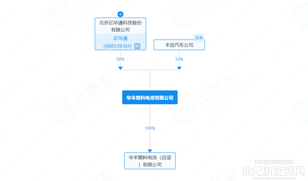 股东信息显示,华丰燃料电池(吕梁)有限公司为华丰燃料电池有限公司100%持股,后者的股东为北京亿华通科技股份有限公司、丰田汽车公司,各持股50%。