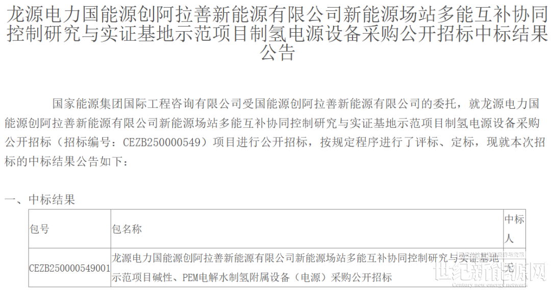 3月3日,龙源电力国能源创阿拉善新能源有限公司新能源场站多能互补协同控制研究与实证基地示范项目制氢电源设备采购公开招标中标结果公告,无中标人。