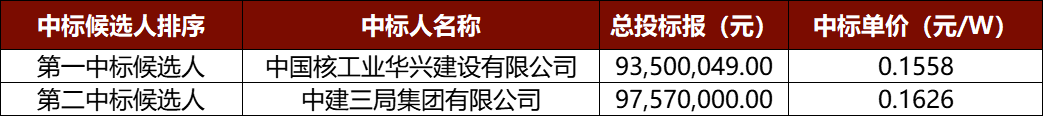 第一中标候选人:中国核工业华兴建设有限公司,投标报价:93500049.00元,第二中标候选人:中建三局集团有限公司,投标报价:97570000.00元。