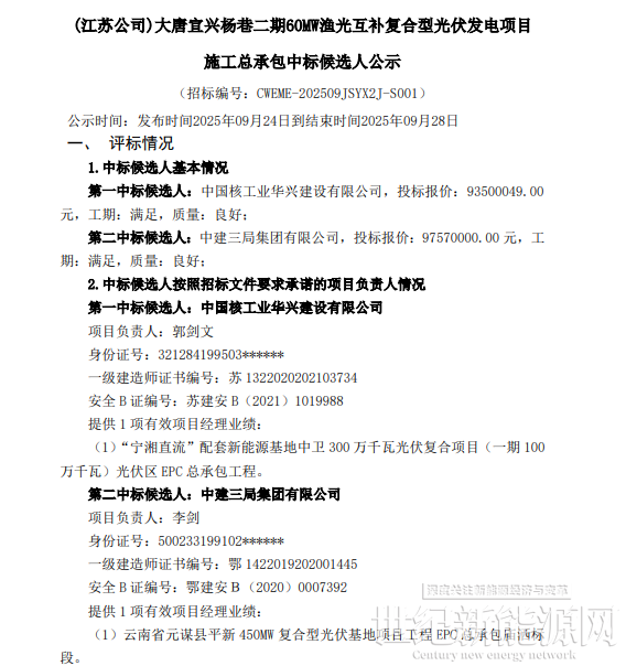 9月24日,【(江苏公司)大唐宜兴杨巷二期60MW渔光互补复合型光伏发电项目施工总承包】中标候选人公示。
