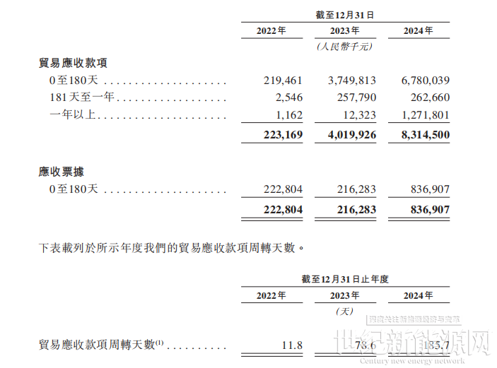 除盈利模式受疑外,海辰储能还面临应收账款高企与负债率攀升的双重压力。2022至2024年,企业的贸易应收款项从2.23亿元激增至83.15亿,相当于2024年营收的64%,应收账款周转天数也从不到30天延长至186天,回款能力明显减弱。