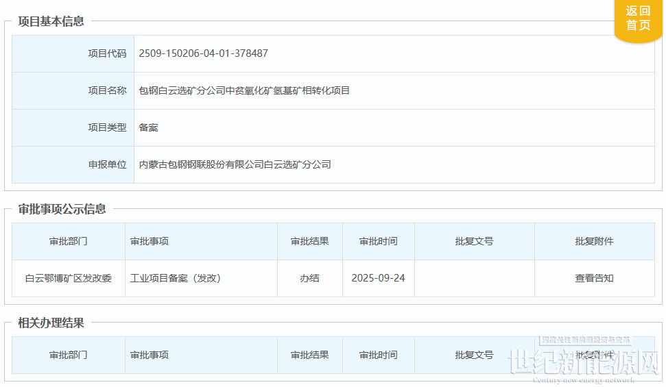 9月24日,内蒙古自治区投资项目在线审批办事大厅发布,包钢白云选矿分公司中贫氧化矿氢基矿相转化项目备案完成。