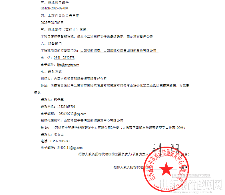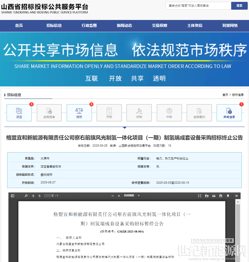 9月26日,山西省招标投标公共服务平台发布格盟宜和新能源有限责任公司察右前旗风光制氢一体化项目(一期)制氢端成套设备采购招标暂停公告。
