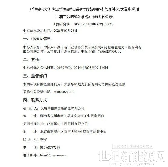 9月26日,【(华银电力)大唐华银新田县新圩站90MW林光互补光伏发电项目二期工程EPC总承包】中标结果公示。