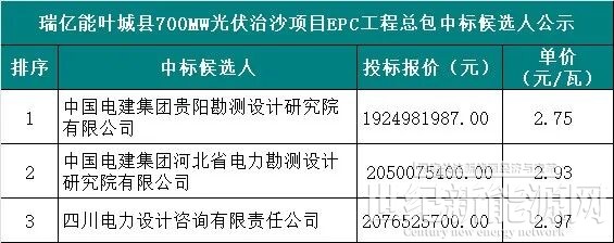 9月27日,叶城瑞亿能新能源有限公司瑞亿能叶城县70万千瓦光伏治沙项目EPC工程总承包中标候选人公示,中国电建集团贵阳勘测设计研究院有限公司以2.75元/瓦位列第一候选人。