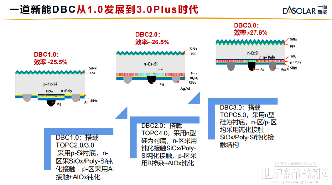 在光伏技术百花齐放多的当下,针对不同应用市场的技术多元化已成为衡量光伏企业综合实力的核心标志。BC 技术凭借其高正面转换效率与出色的外观设计,在 BIPV 等细分市场展现出巨大应用潜力。随着光伏技术与应用场景的深度融合,BC 正成为推动光伏产业向场景化和细分市场发展的新方向。一道新能依托其“一主三翼”前瞻性的战略布局、深厚的TOPCon技术积累和卓越的创新能力,通过将 TOPCon 钝化接触技术与 BC 背电极架构相结合,形成了拥有自主知识产权的DAON-BC 技术(简称DBC)。历经持续技术迭代,DBC 技术的发展路径和应用场景清晰,现已从 DBC 1.0 阶段演进到 DBC 3.0 Plus,第三方测试最高效率超过27.77%,具备引领行业发展的实力。