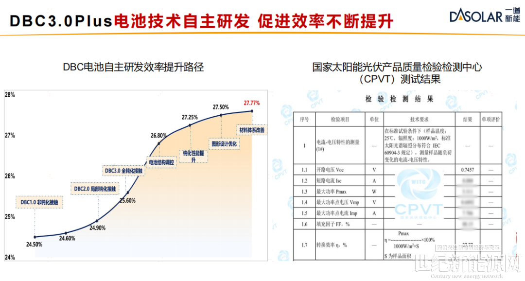 当前,一道新能已攻克多项关键技术难题,将项目研发成果转化为实际生产力。在电池效率提升方面,公司通过新材料、新原理、新工艺、新结构的创新,成功将DBC实验室转换效率提升至27.77%,达到行业领先水平,为DBC电池的大规模产业化应用奠定了坚实基础。