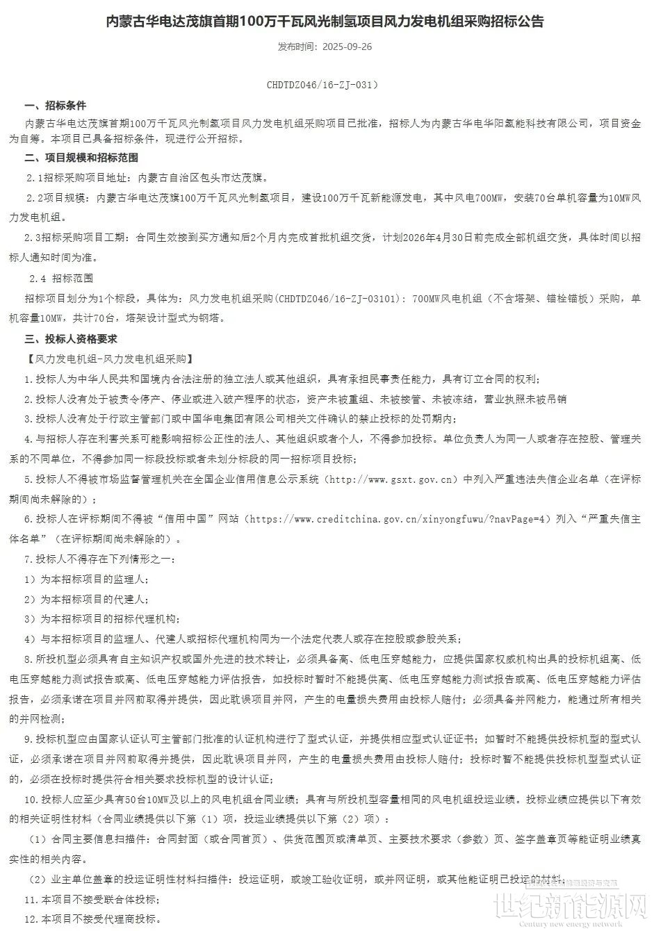 9月26日,内蒙古华电达茂旗首期100万千瓦风光制氢项目风力发电机组采购招标,根据公告,内蒙古华电达茂旗100万千瓦风光制氢项目位于内蒙古自治区包头市达茂旗,建设100万千瓦新能源发电,其中风电700MW,安装70台单机容量为10MW风电机组。