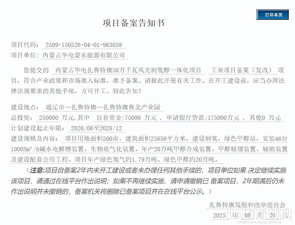 内蒙古华电蒙东能源有限公司提交的内蒙古华电扎鲁特旗50万千瓦风光制氢醇一体化项目工业项目备案(发改)项目,准予备案。
