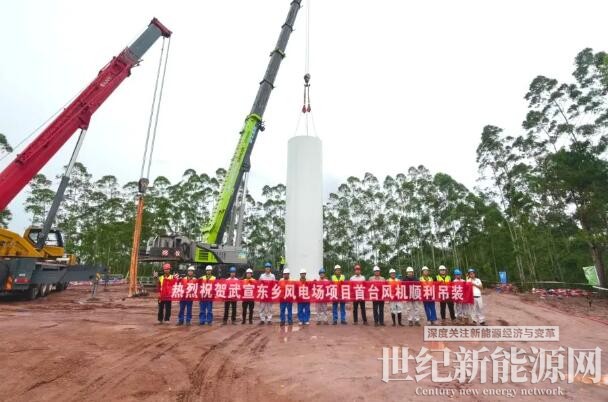 在吊装作业现场,高耸的吊车巨臂缓缓升起,首段塔筒在精准操控下平稳上升,最终与风机基础环完美对接,整个吊装过程井然有序,安全措施全程落实到位。